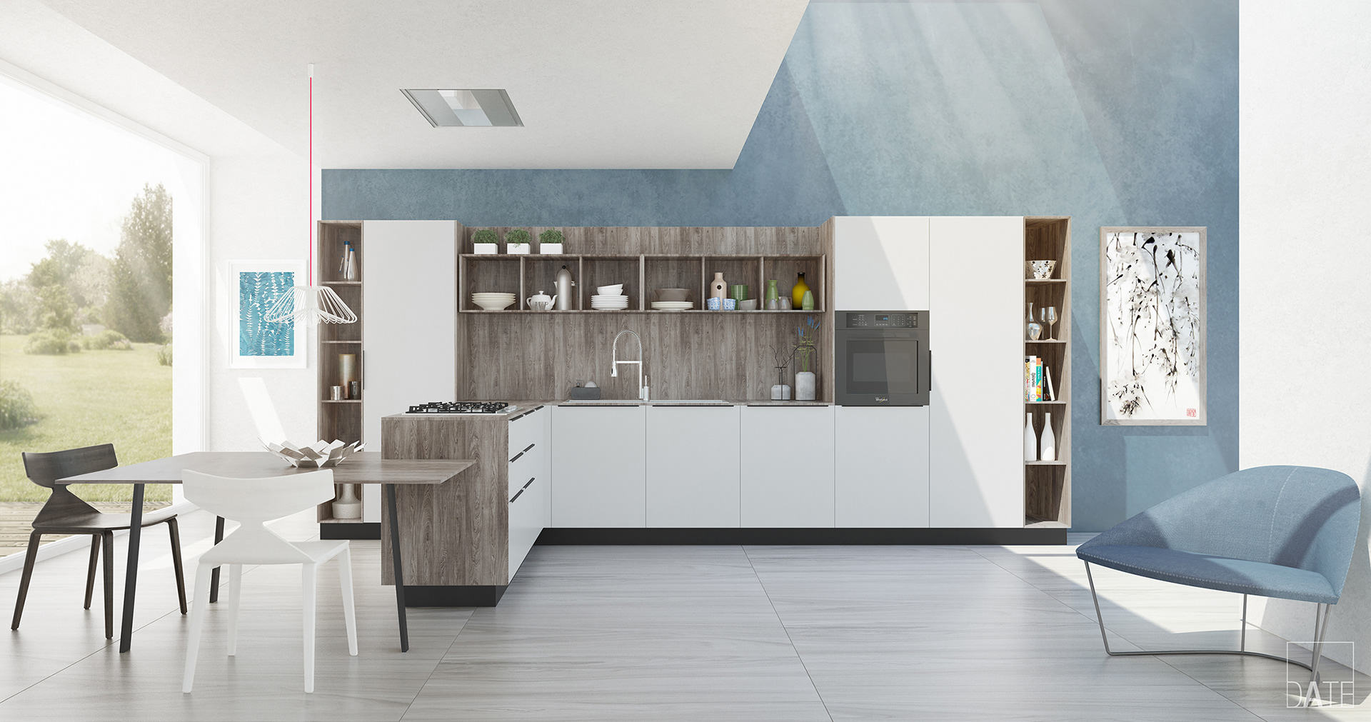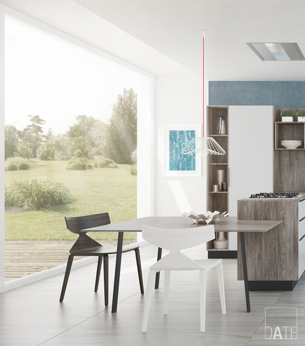 Personal project, based on Ariel kitchen design by Cesar Kitchen with two “Saya” Chairs and a “Colina” sled armchair made by Arper.