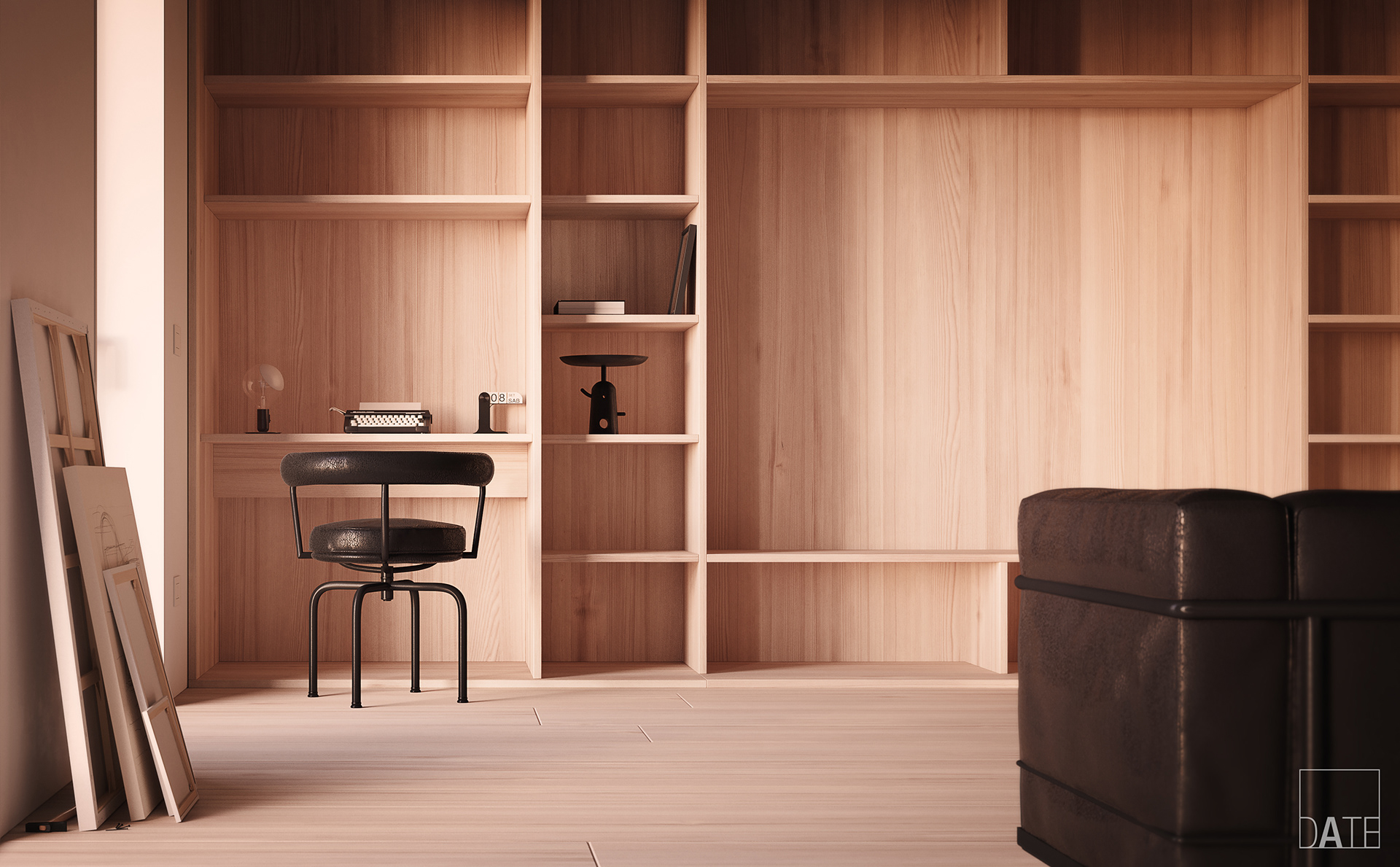 A few images of a concept for a minimal bookcase with integrated desk: a complete and functional hidden home office. The idea behind this wall system was a restrained design achieved through straight and clear lines, where a compact work area blends with the home environment scenically connected by a sliding panel. The result is rigorous, solid, simple but full of meanings.