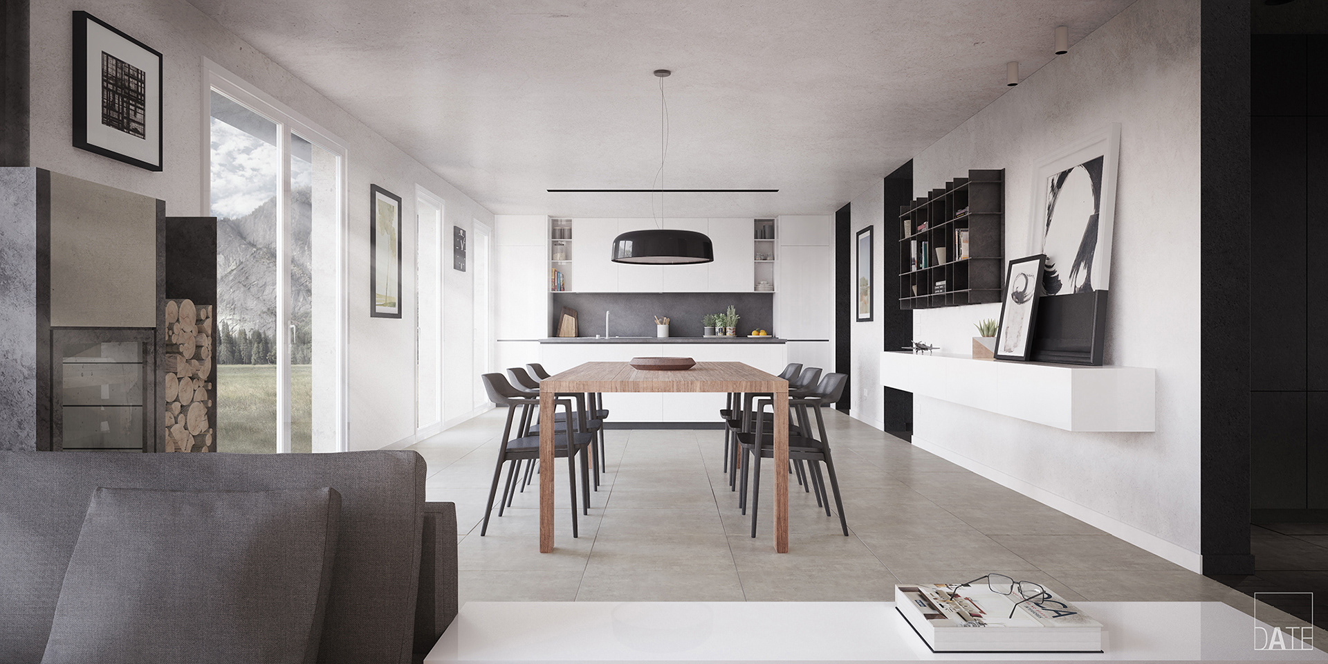 Personal project for a modern summer house composed of a bright open space and matte black service spaces with rough finish. Software: SketchUp 2016 / V-Ray 2.0 / Photoshop CC 2015
